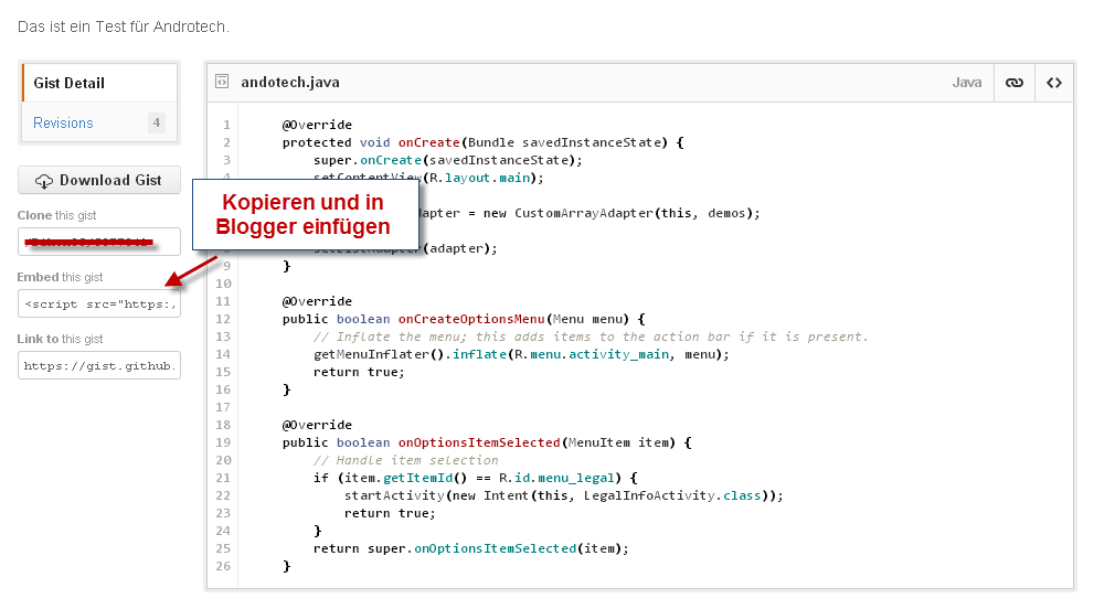 - Dann wählt den Button "Create Public Gist" und kopiert den Eintrag unter "Embed this Gist" ( Bild 1).